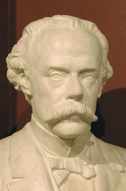 Busto de personaje masculino sobre plinto con gran bigote, cabello ondulado peinado hacia atrás. Viste chaqueta, camisa y pajarita.