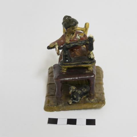 Objeto decorativo de cerámica esmaltada que representa a un personaje femenino sedente ante una mesa donde se ubica una máquina. En el extremo inferior izquierdo vemos una figura zoomorfa.