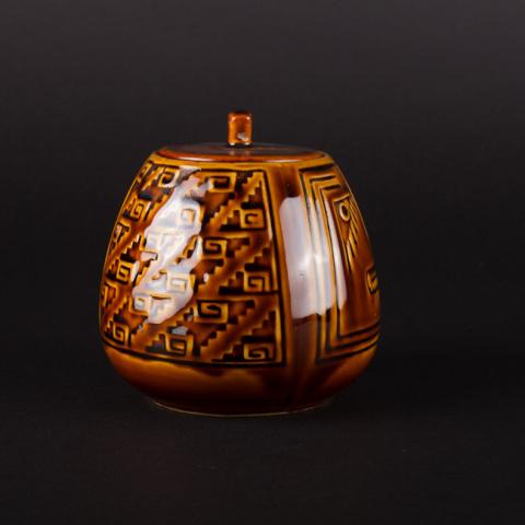Recipiente de forma ovoidal color marrón con rostro de formas geométricas y decoraciones de tipo precolombino. Posee tapa con asa.