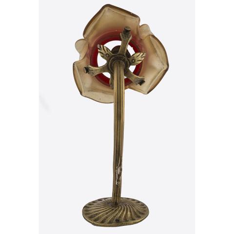 Objeto decorativo, reproduce la figura de una flor elaborada en vidrio y metal, dorado. Al extremo superior tiene pantalla vidriada, formando una serie de segmentos, de extremos en curva de borde redoblado formando pétalos color rojizo y ocre; en su centro tiene dispositivo porta ampolleta. Esta se eleva sobre una eje cilíndrico, en curva y con superficie estriada, junto a la base tiene un elemento prominente con aspecto de hojas; en su interior tiene clables. Al extremo inferior presenta un pie circular, de reverso llano.