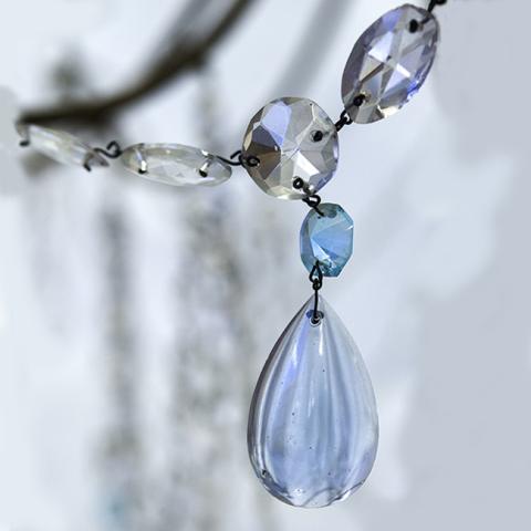 Equipo de iluminación, de tipo araña; esta compuesta de un cuerpo central de madera dorada, del cual se prolongan 8 brazos en curva de bronce que sostienen una porta luz con arandela de vidrio y portalámpara breve. De sus extremos penden y le rodean una serie de caireles con abalorios de cristal cortado; en su mayoría son transparentes y algunas de forma elíptica color azul, tienen la superficie cortada en facetas y del centro pende una gran esfera, maciza.
