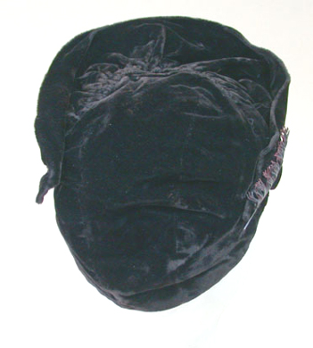 Sombrero de terciopelo café oscuro, con visera repujada. Lleva como adorno una pluma sintética a cada lado. En la parte posterior lleva unos cortes para ajustar en la cabeza.