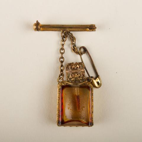 Objeto de uso personal. Contenedor rectangular elaborado en vidrio transparente. En los cantos, malla metálica dorada adherida. En la superficie, diseño floral bordado. Cuello corto cilíndrico con tapa metálica dorada. A ambos lados del cuello, argollas con cadenas fijas a un prendedor rectangular metálico dorado con diseños florales en sobre relieve.