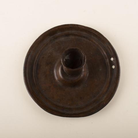 Objeto utilitario. De base y borde redondo. Al centro, un cilindro hueco de borde plano que va sujeto a la base mediante un tornillo. De color café.