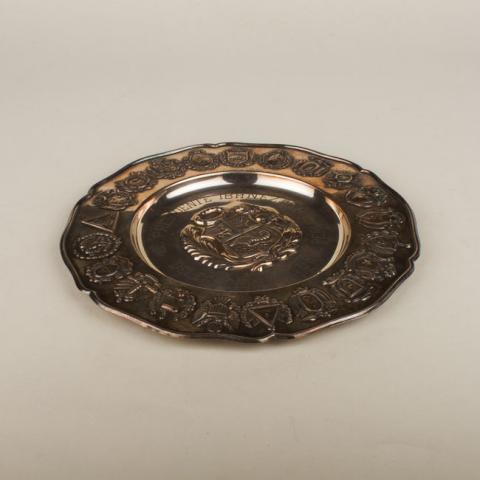 Objeto conmemorativo elaborado en metal. Recipiente circular de borde plano de labio ondeado. En el centro, escudo en sobre relieve e inscripciones incisas alrededor. En el borde escudos diversos en sobre relieve. Base plana.