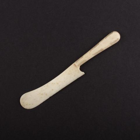 Objeto utilitario. De forma alargada, tiene un mango con ornamentación incisa de características geométricas. Tiene una hoja plana de borde redondo.