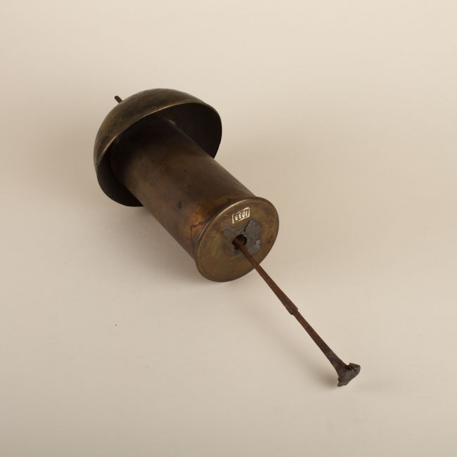 Objeto de uso científico. Compuesto por un elemento semi curvo y hueco en la parte superior, bajo este, un cilindro hueco con una perforación en la zona baja por el cual pasa un tubo delgado que atraviesa todo el instrumento. De color café, la superficie es lisa.