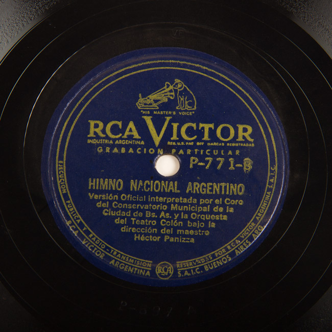 Objeto de uso doméstico compuesto de dos piezas, un disco de vinilo y su carátula. El disco de vinilo es de forma circular y de color negro. Tiene surcos en circunferencia. Al centro tiene un agujero y una etiqueta central y circular de color azul e impresiones tipográficas en dorada. Se encuentra inserto en un sobre carátula de color café con la imagen de un perro mirando una vitrola.