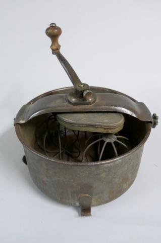Recipiente de forma redondeada con asa que presenta manivela con mango de madera. En su interior presenta una pieza metálica, unida a la manivela, en que se articulan dos figuras globulares en base a alambres modelados.
