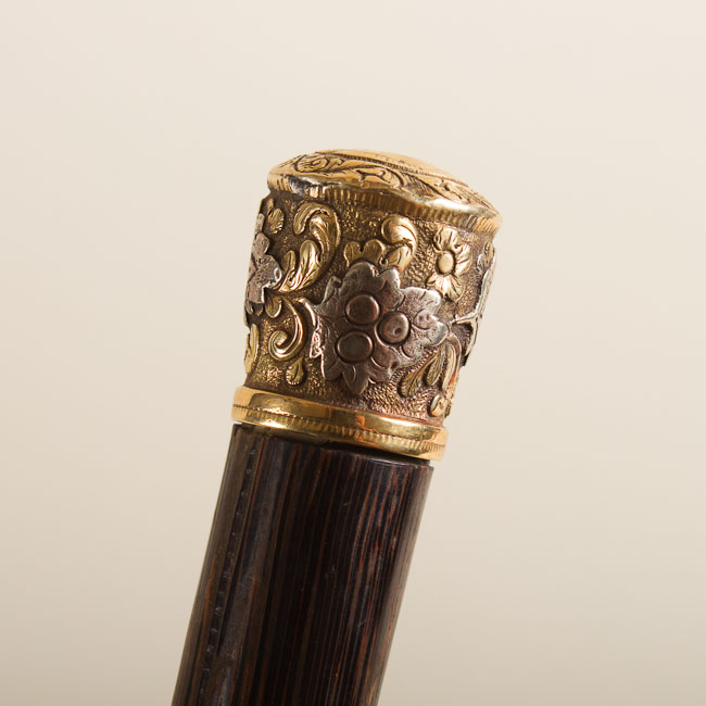 Objeto de uso personal. Cilindro de madera con vetas. Superficie lisa. Un extremo de menor diámetro. En el opuesto terminación cilíndrica elaborada en metal dorado. Decoración floral en el canto e inscripción incisa en la superficie.