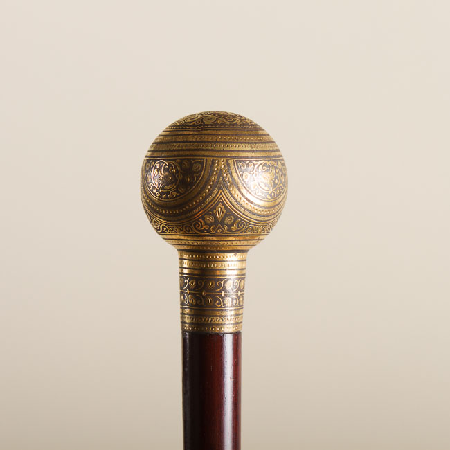 Objeto de uso personal. Madero cilíndrico de superficie lisa color café. Apuntado hacia un extremo con tope metálico. En el opuesto bola a modo de empuñadura. En la superficie diseños dorados sobre fondo negro.