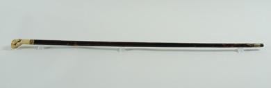 Objeto de uso personal. Cilindro de madera cubierta por carey, de superficie lisa y color café jaspeado. En un extremo tope metálico. En el opuesto anillo metálico y figuras ornitomorfas entrelazadas a modo de empuñadura. En el anillo metálico presenta inscripciones en bajorrelieve.