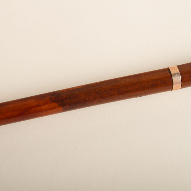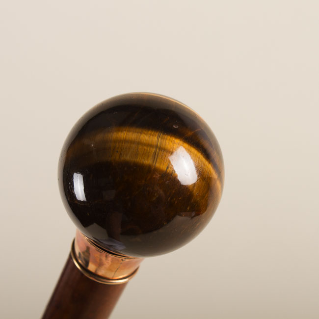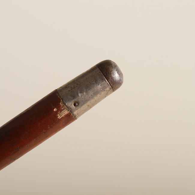 Objeto de uso personal. Cilindro de madera de superficie lisa. En un extremo puntal cilíndrico y redondeado, de metal. En el opuesto esfera de vidrio de color marrón tornasolada, unido al cuerpo mediante anillo de metal. Bajo la empuñadura hay anillo metálico.