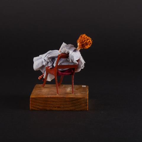 Objeto de uso artístico. Figura femenina sedente sobre silla posada en una base cuadrada, viste de celeste y calza sandalias romanas. Posee cabellos rubios atados en moño sobre la nuca-