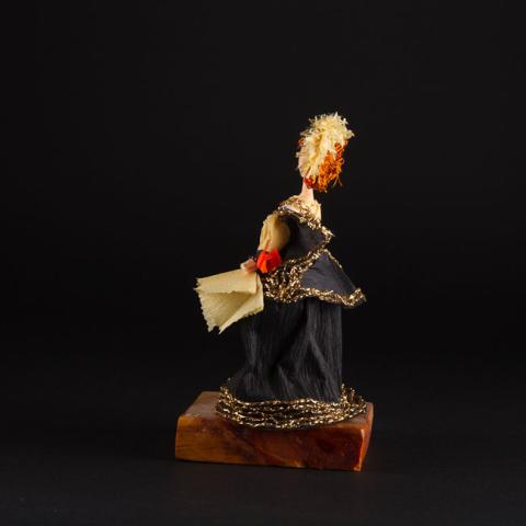 Objeto de uso artístico. Figura femenina de cuerpo entero y de pie sobre una base cuadrada. Viste traje negro con aplicación dorada, anchas mangas amarillas con apertura con las manos extendidas. Collar de mostacillas en el pecho. Pañuelo en la mano derecha. Cabellos trenzados con lazos en el extremo inferior.