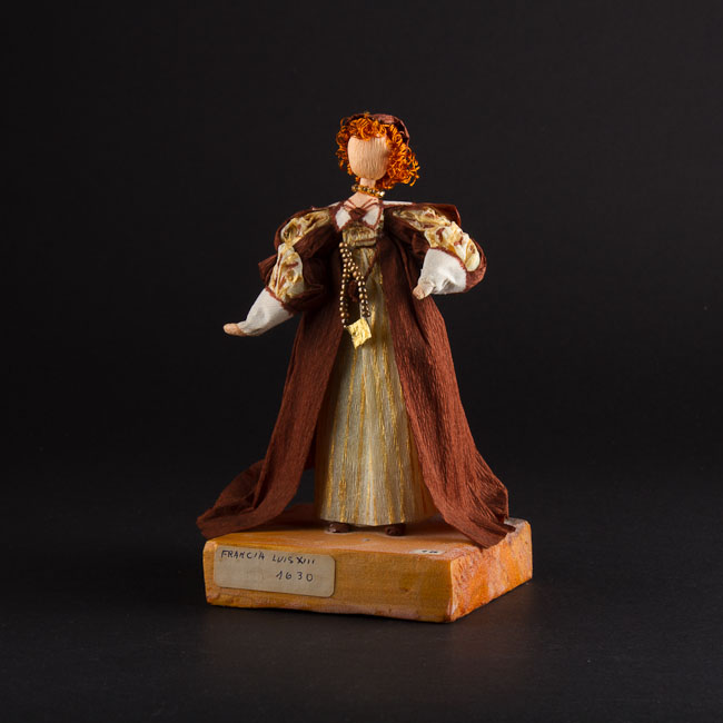 Objeto de uso artístico. Figura femenina de cuerpo entero y de pie sobre base cuadrada. Viste de marrón y blanco con rayas amarillas, amplias mangas. En el pecho, una cuelga de mostacillas. Cabellos ondulados cortos, sombrero café.