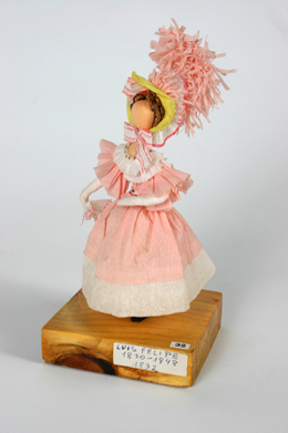 Objeto de uso artístico. Figura femenina de cuerpo entero y de pie sobre base cuadrada. Posee vestido rosado con franja blanca en el sector inferior y amplias mangas; escote con vuelos blancos, ancha cinta en el cuello. Cabello café con bucles, sombrero amarillo que se amarra bajo la cara con un adorno sobresaliente de flecos rosado.