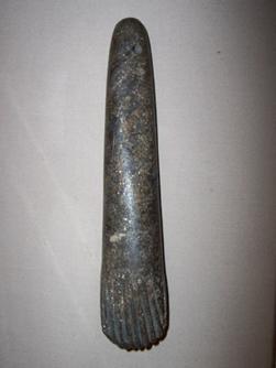Objeto de forma troncónico irregular con ambos extremos redondeados y uno de ellos afilado a bisel. Tiene una perforación bicónica en el sector superior y se encuentra inciso con líneas paralelas en la parte inferior. Está fabricado en piedra tallada y pulida de color marrón brillante