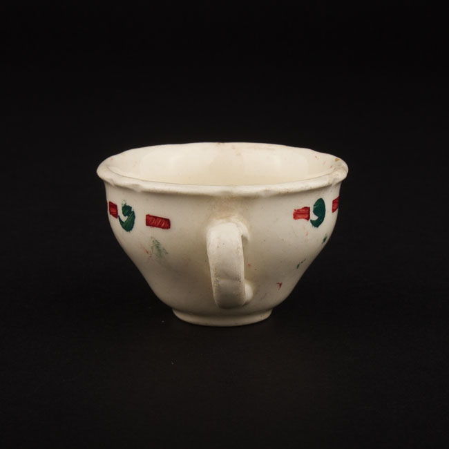 Objeto de uso doméstico elaborado en cerámica esmaltada y policromada. Contenedor de cuerpo globular. Boca amplia, borde evertido y labio ondeado. Un asa. Base plana restringida de pedestal. Superficie blanca con diseño floral de color rojo y verde pintado. En el borde, diseños en color rojo y verde.