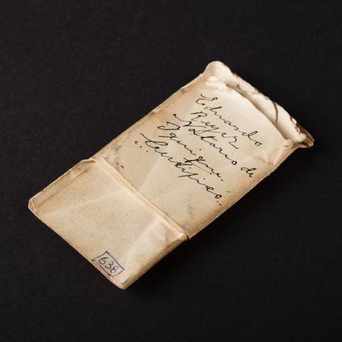 Objeto de forma rectangular. Por el anverso presenta una firma en partes superior, y bajo de ello, un lacre de color rojo con una cruz al centro y una leyenda en circular.
