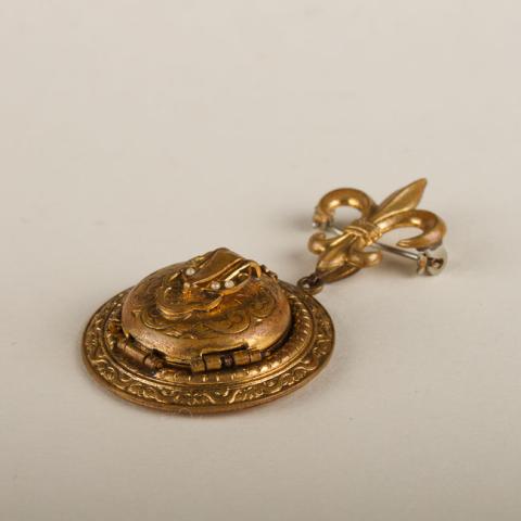 Objeto de uso personal. De forma redonda y color dorado, decorado en el borde por una franja con motivos fitomorfos. La parte central es una semiesfera que se abre mediante una bisagra, al interior lleva una una tapa que cubre un espacio con base curva, sirve para guardar algo pequeño. En la parte superior lleva un anillo sobre el cual va una figura fitomorfa terminada en punta y engarce de 6 pequeñas perlas. Por el reverso un alfiler que permite la sujeción.