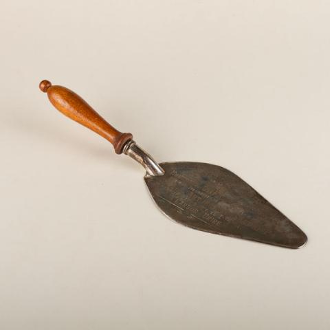 Objeto de uso conmemorativo. Lámina metálica lanceolada con inscripciones incisas. En un extremo mango cilíndrico de madera y terminación redondeada fija y encajado. Por el reverso es liso.