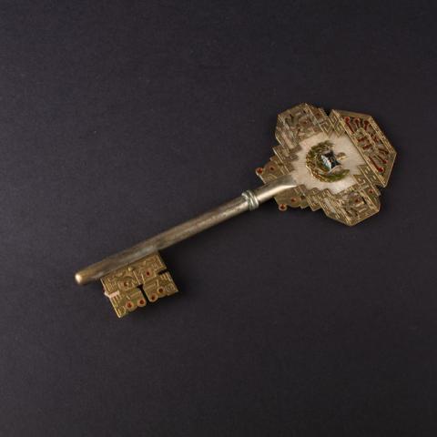 Objeto de uso conmemorativo. Cilindro que remata en un elemento cuadrado decorado en dos bandas simétricas de color dorado con cabezas zoomorfas con incrustaciones circulares en rojo. En el otro extremo una figura plana de bordes rectos con una decoración en calado con dos bandas simétricas enfrentadas que llevan una cabeza ornitomorfa y una figura antropomorfa con características ornitomorfas. Al centro un escudo en sobre relieve enmarcado en dos bandas vegetales. Por el reverso es liso.