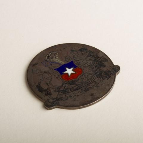 Pieza formada por disco metálico plateado con escudo en tono blanco y rojo, estrella blanca al adentro. Lo rodean un cóndor y un huemul, en el sector inferior, inscripción de letras.