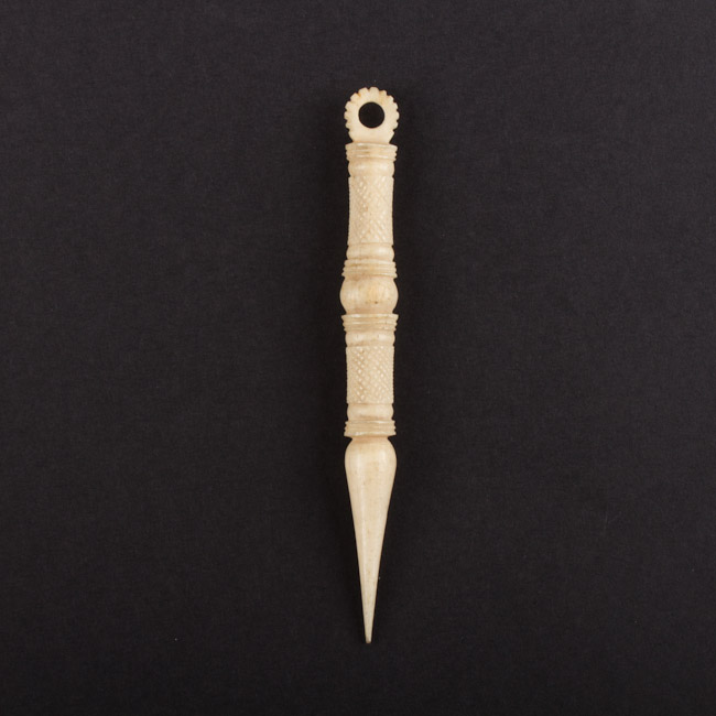 Objeto alargado cilíndrico con ornamentación geométrica en sobre relieve. En la parte superior lleva un anillo, en la parte inferior es punteado. De color blanco.