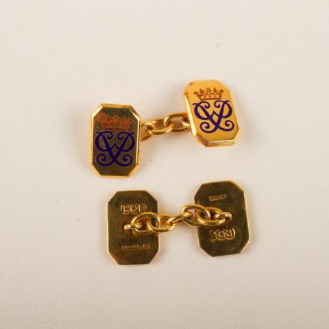 Colleras: Dos placas rectangulares doradas con monograma de letras azules y corona roja unida mediante caderas.