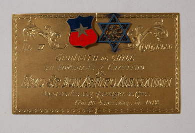 En la parte superior lleva una pieza distinta adherida con un escudo de color rojo y azul con una estrella al centro, al lado derecho una estrella de seis puntas. A los costado una decoración fitomorfa incisa. Mas abajo una leyenda incisa. Por el reverso es liso.