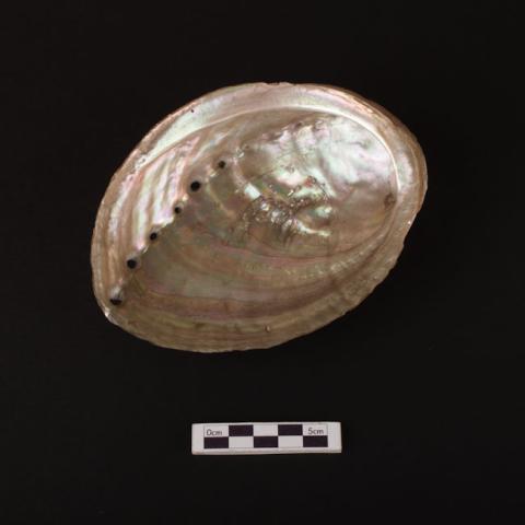 Objeto de uso decorativo. Bivalvo con cinco perforaciones en línea. Al interior presenta una cavidad y es nacarado.