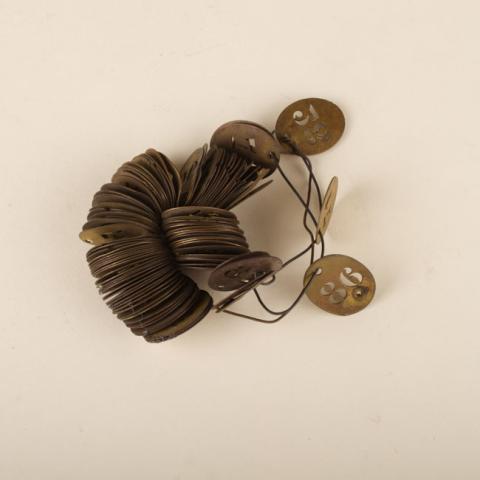 Compuesto por noventa y dos figuras ovaladas planas con un numero calado. Los números son correlativos. En la parte superior una perforación circular. De color dorado.