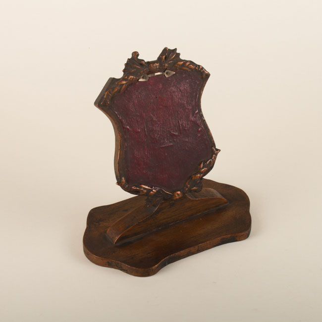 Objeto de uso religioso. Compuesto por una base semi ovalada de seis caras, de borde recto y liso. Al centro, un pie recto de bordes curvos que sostiene una pizarra con decoración fitomorfa, lleva un gancho central sujeto mediante dos tornillos. La pizarra esta levemente inclinada hacia atrás.