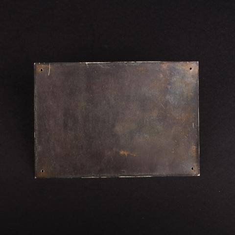 Objeto de uso conmemorativo. De forma rectangular y de color gris. Tiene una leyenda incisa en el centro. Arriba y en el borde inferior izquierdo una decoración fitomorfa. Lleva cuatro perforaciones circulares en cada esquina. Por el reverso es liso.