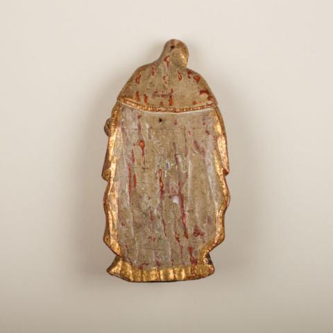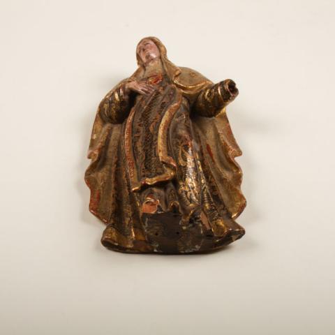 Figura femenina de pie tallada en madera policromada. Rosto inclinado. Brazos flectados. Mano derecha sobre el pecho junto a un corazón rojo con llama en la parte superior. Viste túnica larga negra con diseños dorados y esclavina, velo y capa blanca con diseños dorados.