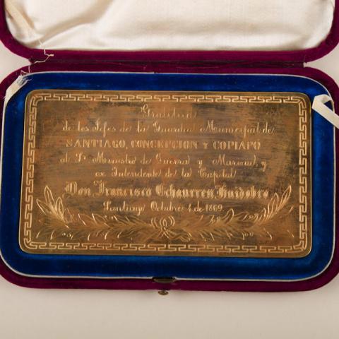 Se encuentra al interior de una caja rectangular forrada con terciopelo rojo, con tapa de bisagra. Tiene inscripciones doradas en la cara superior.