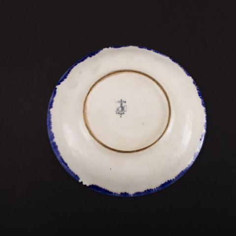Objeto de uso domestico. Recipiente de base redonda, cuerpo liso y asa lateral.Tiene asociado un plato de forma cóncava y base redonda.De color azul y blanco.