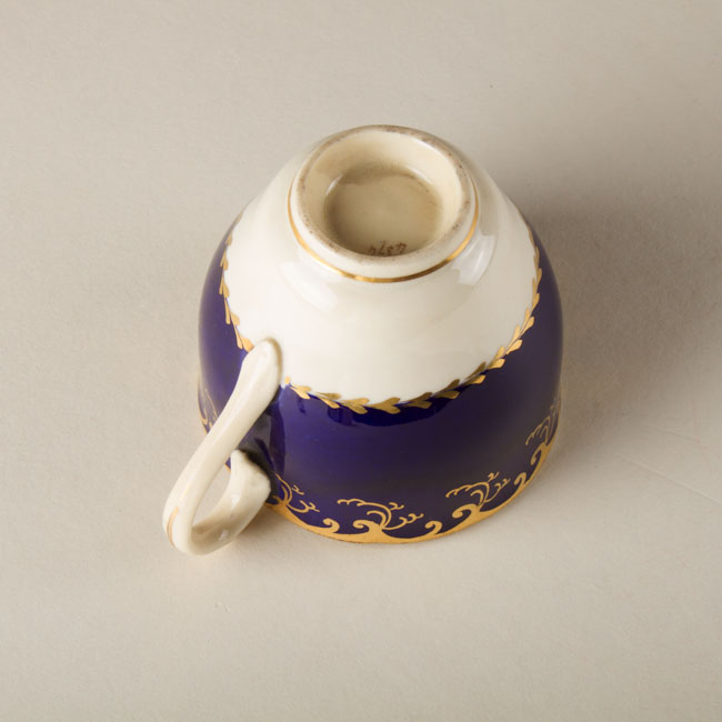 Objeto de uso doméstivo. Recipiente cilíndrico y color blanco. Sector inferior blanco delimitado por una guirnalda de hojas en dorado. El sector superior en azul cuyo borde se decora con volutas doradas dispuestas verticalmente que nacen desde una franja dorada. Asa en voluta con aplicación dorada en el sector superior.