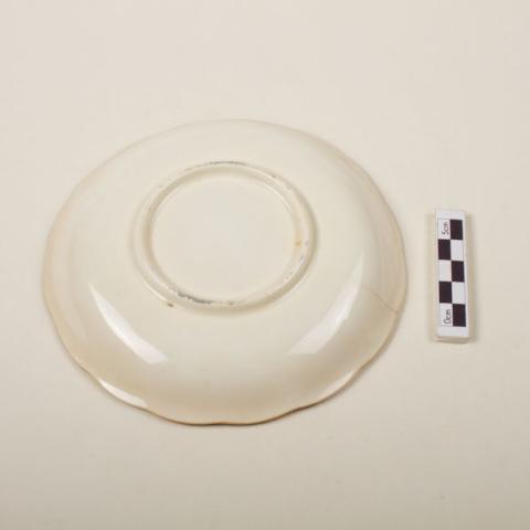 Objeto de uso doméstico. Recipiente plano cóncavo circular y color blanco. Centro blanco rodeado por guirnalda de hojas en dorado. A su alrededor y los bordes se decoran en azul con volutas doradas dispuestas verticalmente que nacen desde una franja dorada.