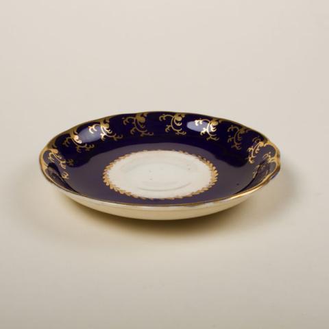 Objeto de uso doméstico. Recipiente plano cóncavo circular y color blanco. Centro blanco rodeado por guirnalda de hojas en dorado. A su alrededor y los bordes se decoran en azul con volutas doradas dispuestas verticalmente que nacen desde una franja dorada.