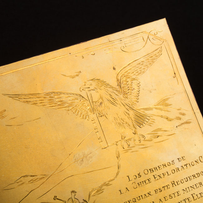 Objeto conmemorativo. Lámina metálica rectangular. Superficie dorada lisa. Decoración incisa. Paisaje con cerros, una industria y un minero. En el fondo, volcán. En la esquina superior izquierda, manos enlazadas sobre corazón. En la esquina superior derecha, ave con alas abiertas y figura colgando del pico. En la esquina inferior derecha, inscripción.