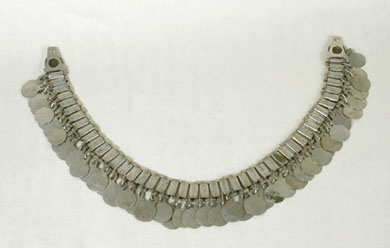 Adorno de plata de uso femenino que se lleva en la cabeza. Está compuesto por una cadena de eslabones rectangulares y planos, de los cuales cuelgan láminas circulares. En los extremos tiene un broche con forma de venera. Plata de color gris brillante.