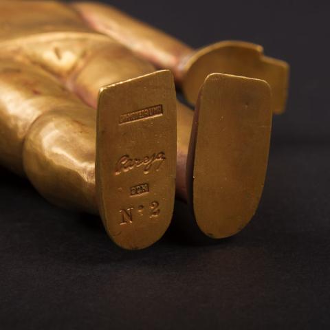 Objeto decorativo. Figura antropomorfa de pie elaborada en metal. Cabeza calva, pendientes en las orejas y borde en sobre relieve en los ojos. Manos al costado del cuerpo y palmas hacia afuera. Superficie lisa dorada.