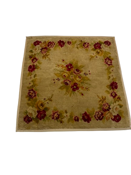 Alfombra elaborada en lana en tonos de beige, verde y rojo, con un motivo central de flores y también con flores alrededor. En el borde lleva una huincha de algodón.