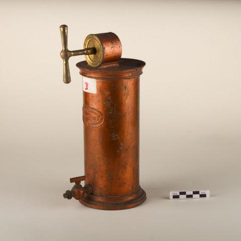 Objeto de uso doméstico personal. Cilindro metálico de base circular con inscripción en sobrerrelieve en el sector central. En el sector superior se dispone cilindro de menor tamaño con asa alargada sobresaliente. En el sector inferior, llave esférica con asa rectangular.
