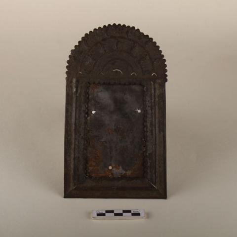 Objeto de uso decorativo. Pieza oscura rectangular cuyo sector central es liso, rodeado de franja dentada. Sector superior en semicírculo de borde dentado decorado en sobrerrelieve con motivos fitomorfos.