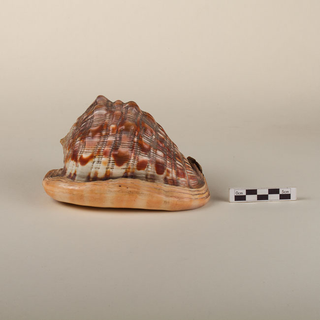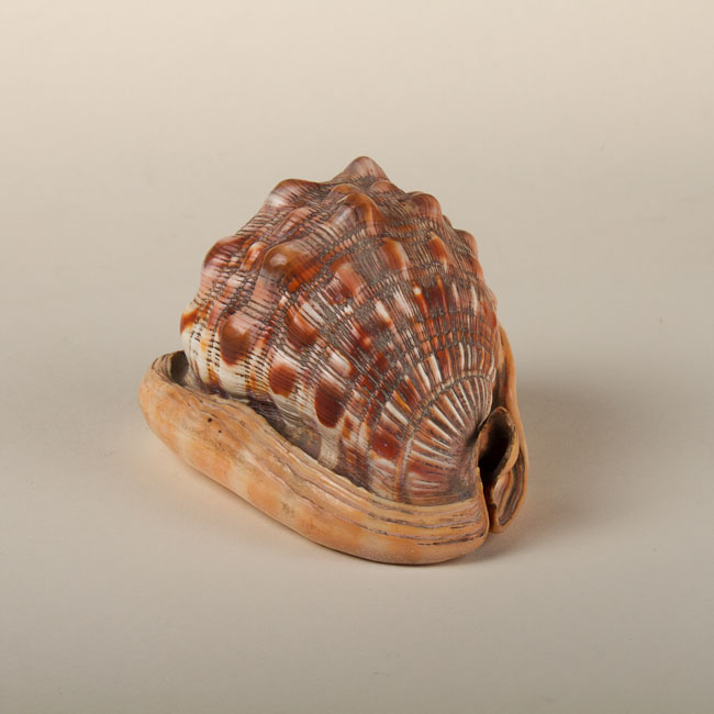 Objeto de uso decorativo. Caparazón de molusco de tonos anaranjados y marrones, superficie estriada y rugosa.