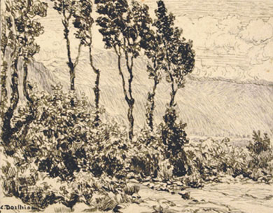 Composición que representa un paisaje con camino bordeado por vegetación y una fila de árboles de troncos y ramas delgadas, hacia el cuadrante izquierdo. En segundo plano, se observa una montaña y cielo nuboso.