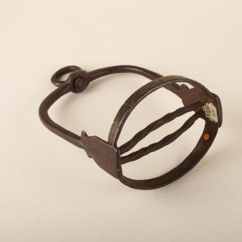Objeto utilitario. Un ovalo de base que sostiene un arco rematado por un circulo que tiene un mango y que penetra en un orificio. En la base, dos elementos de fierro que cruzan desde la base del arco y que permiten apoyar el pie al cabalgar.